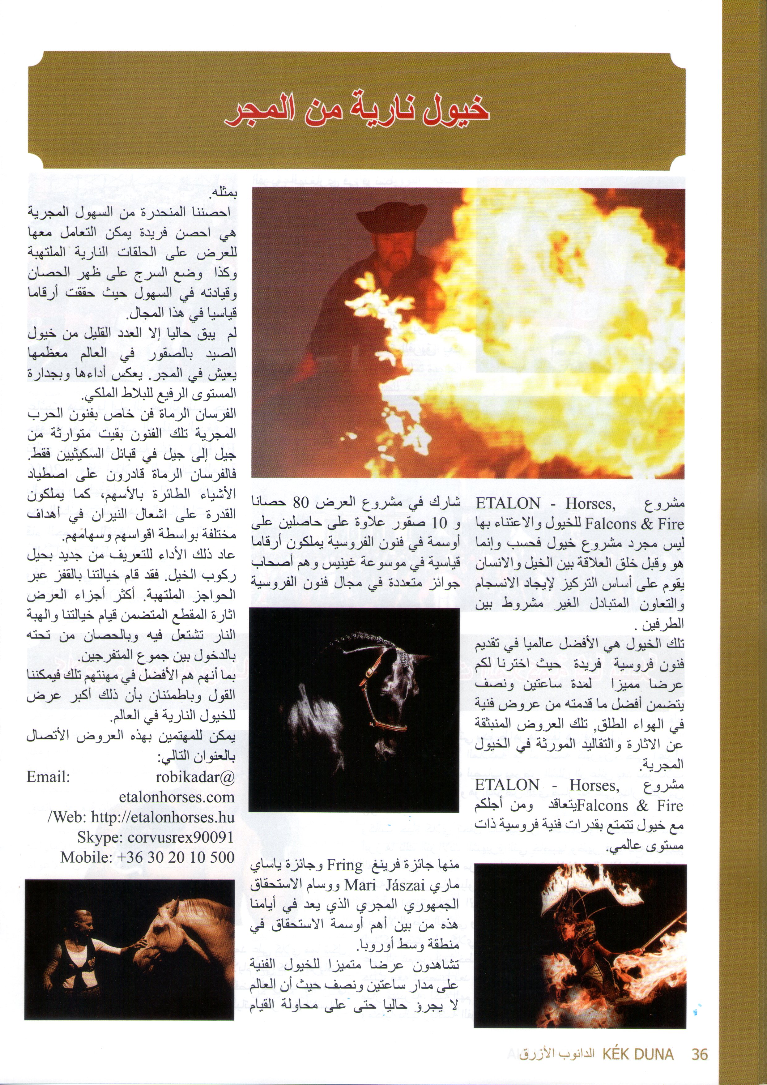 所有参展的美丽马匹均出生于匈牙利,并由传统的匈牙利血统培育而成。然而,火骑表演中包含了一匹阿拉伯-沙吉亚混血马。ETALON马匹在接近自然环境的条件下饲养,并接受了专业人士的精心训练。团队成员学习了马的无声语言——Equus。